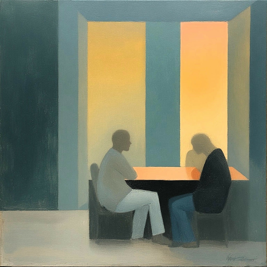 This Ai painting captures two figures seated at a table, their forms simplified and almost silhouetted against a backdrop of warm, glowing light. Two prominent rectangular panels, radiating hues of golden yellow and soft orange, illuminate the scene, contrasting with the cool, deep teal and blue-gray walls.