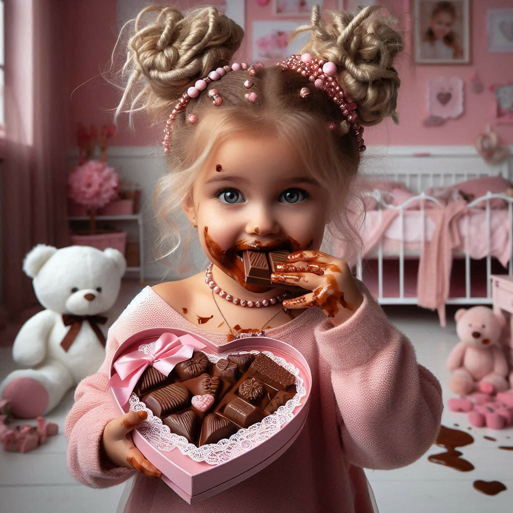 The image shows a young girl with blonde hair styled in two buns, adorned with pink beaded headbands. She has large blue eyes, and her face and hands are covered in chocolate. She is eating a piece of chocolate from a pink heart-shaped box that she is holding. The box is filled with various chocolates and is finished with a white lace trim and a pink bow.