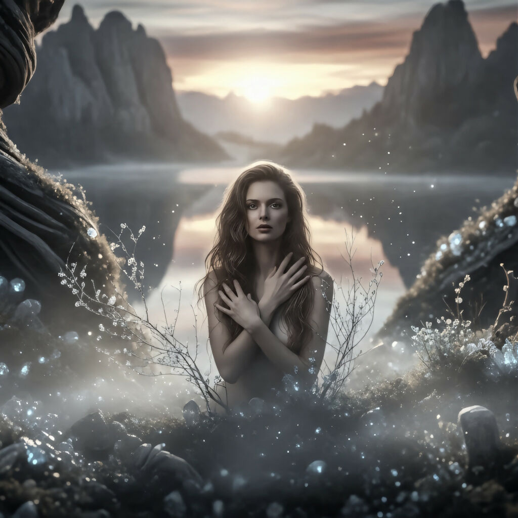 Magical portrait of a woman in a shimmering, misty mountain landscape at dawn, reflected beautifully in the calm lake water.
