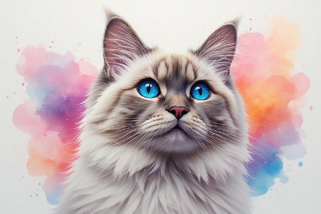 This stunning piece features a fluffy feline with piercing blue eyes and soft fur, set against a vibrant watercolor background of pastel pinks, purples, and oranges. The dreamy, misty effect in the background adds a touch of whimsy and magic, making this artwork perfect for cat lovers, digital art collectors, or anyone who appreciates serene and fantastical imagery.