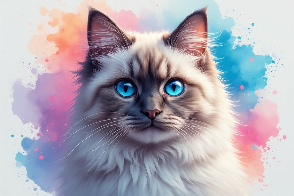 This piece showcases a regal feline with striking blue eyes and luxurious fur, surrounded by a colorful, abstract background of swirling blues, pinks, and purples. The soft, dreamlike quality of the image evokes a sense of wonder and tranquility, making it a perfect addition to any home or digital collection.