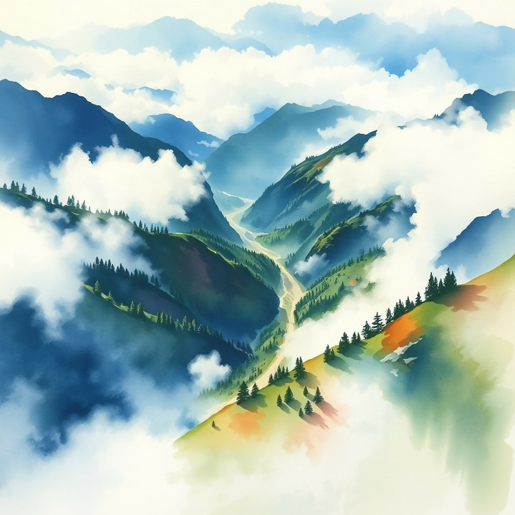 A serene aerial photograph looking down upon a deep valley nestled between rugged mountain peaks. A thick, ethereal blanket of fog fills the basin, obscuring the forest floor and creating a soft, textured contrast with the dark, silhouetted ridges and slopes.