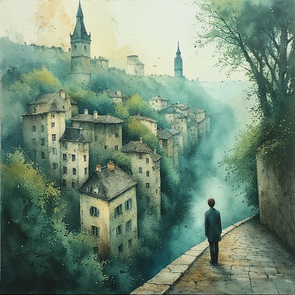 This watercolour painting portrays a solitary figure standing on a worn cobblestone path, looking out over a picturesque, ancient town nestled within a verdant valley.