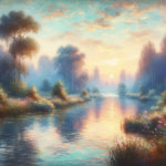 This AI-generated digital painting captures the serene beauty of a riverbank at sunrise. Gentle morning mist drifts over the water as soft pastel colors reflect across the surface. The dreamlike scene evokes a sense of calm and stillness, making it a perfect addition to any space that needs peace and inspiration.