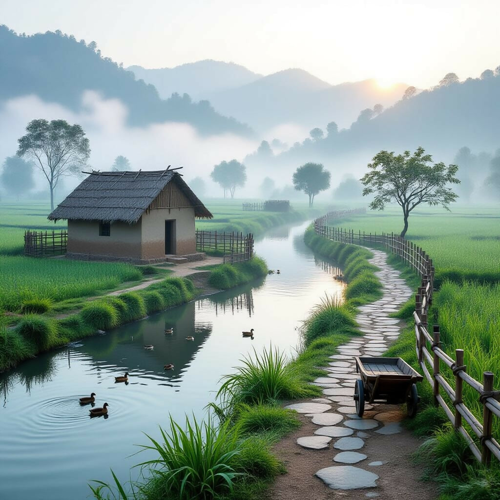 This artwork captures a beautifully calm and misty Indian village morning in a luxurious wall-painting style. A cozy mud house stands beside a gently flowing river surrounded by dew-covered green fields and bamboo fencing. The distant hills fade softly into the fog as warm golden sunlight peeks through, creating a peaceful glow. Ducks rest near the riverbank and smoke rises from a morning chulha, adding warmth and authenticity to the scene. Designed in an oil + watercolor blend with cinematic softness, this wallpaper