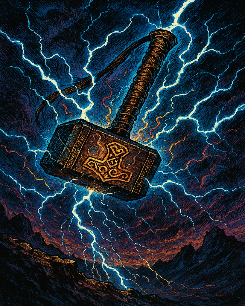 Mjölnir – The Hammer of Shattered Skies is a dark fantasy tribute to Norse mythology, rendered in gothic comic style.