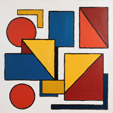 A dynamic wall art piece blending geometric curves and bold strokes in blue, yellow, and red. The flowing composition brings energy and modern sophistication to any interior setting.