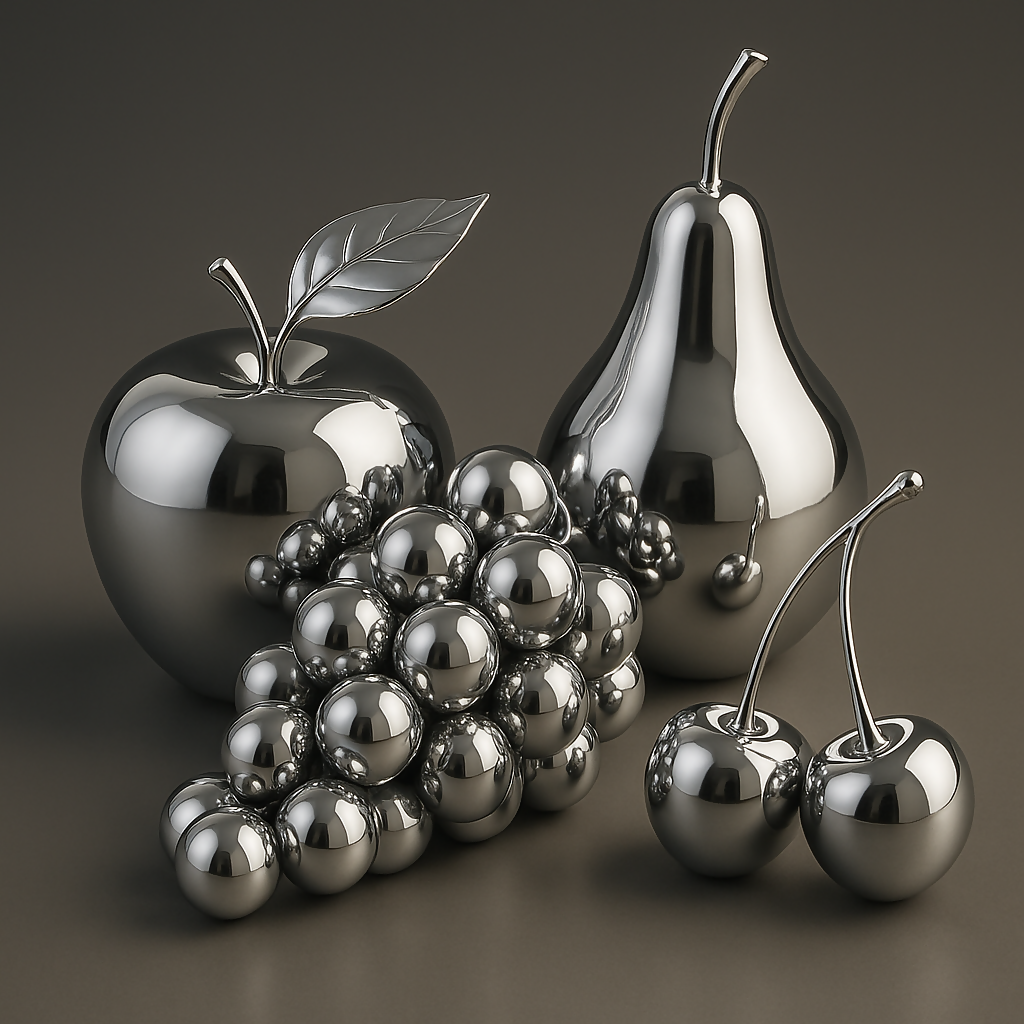A stunning fusion of nature and modern design, this artwork features a collection of mirror-polished metallic fruits—an apple, pear, grapes, and cherries—crafted with breathtaking detail. Their reflective surfaces shimmer with light, creating a mesmerizing play of shadows and shine. Blending organic forms with futuristic materials, this piece captures the essence of elegance, innovation, and timeless beauty. Perfect as a symbol of abundance and sophistication, it’s a true statement of artistic luxury.