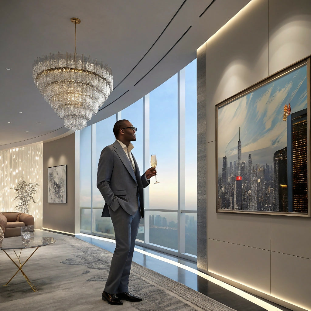 A man in a light gray suit stands in a modern, high-end interior space, gazing at a cityscape painting hung on a wall.