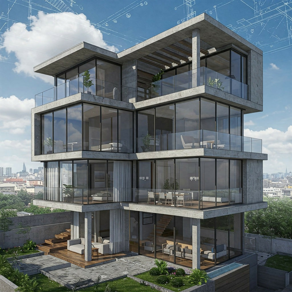 A stunning architectural rendering of a contemporary multi-story house featuring expansive glass windows, a robust concrete structure, and a rooftop terrace with city skyline views. Detailed blueprint overlay in grayscale adds an artistic touch.