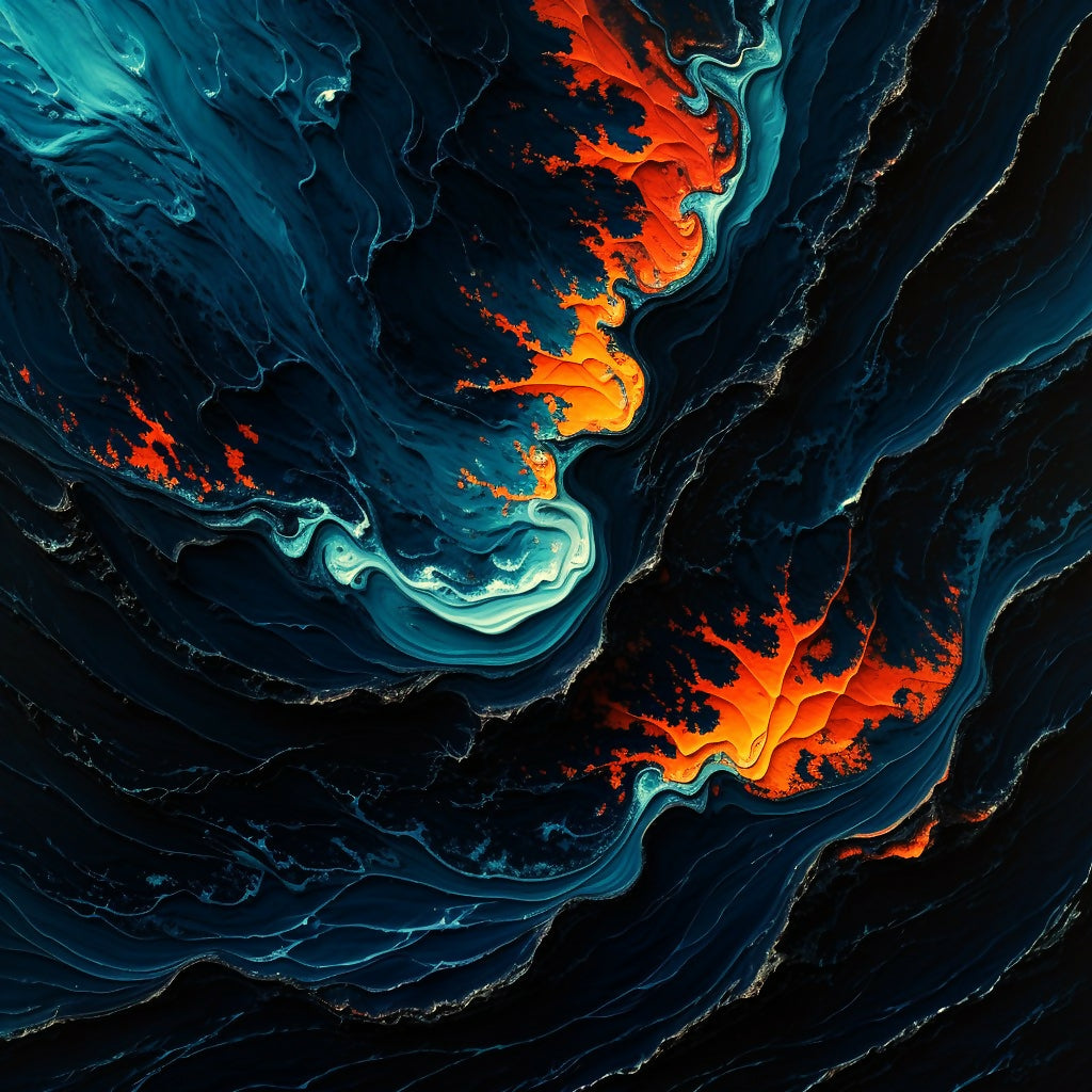 An abstract masterpiece featuring fluid, swirling patterns in deep blues and blacks, contrasted by vibrant orange and teal highlights. The dynamic interplay of colors and textures creates a striking visual experience, perfect for modern interiors and artistic collections.