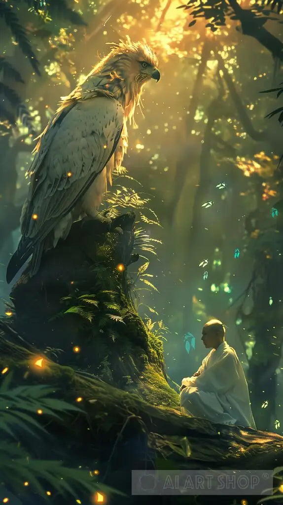 "Whispers of the Dharma" transcends a simple depiction of a monk and a bird. It portrays a silent exchange of knowledge and understanding, a connection that transcends the need for words. The artwork's ethereal quality, achieved through the use of AI, creates a sense of peace and serenity, inviting the viewer to contemplate the interconnectedness of all living things and the path to enlightenment.