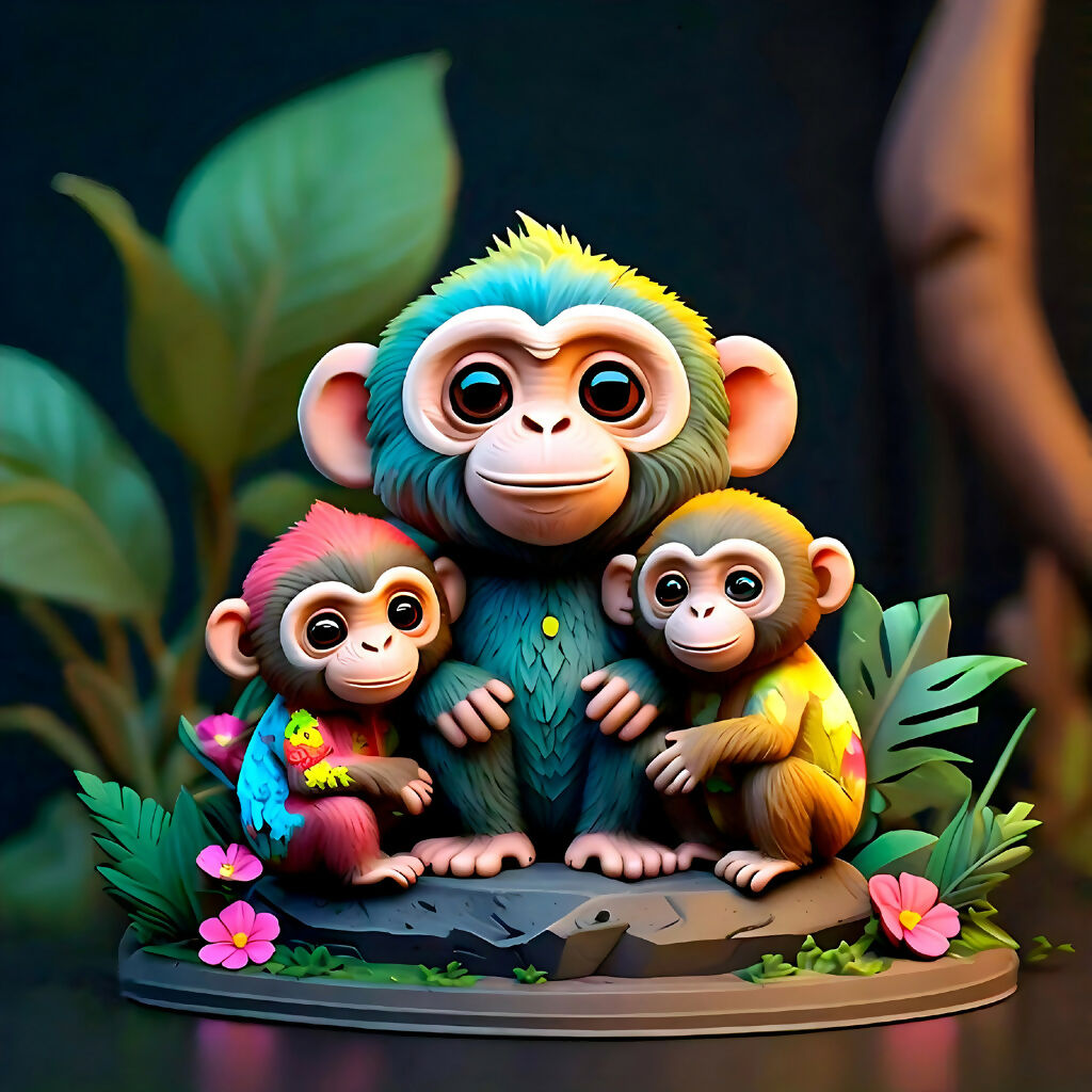 Bring a burst of jungle joy to your space with Monkey Mischief Trio, a lively AI-generated pop art illustration featuring three cartoon-style monkeys in a lush tropical setting. The central monkey, with electric blue and green fur and a cheerful yellow tuft, holds hands with two equally expressive companions—one in fiery red-pink tones and the other in warm yellow-brown hues. Set against a backdrop of oversized green leaves and blooming pink flowers, this artwork radiates playful energy and bold color harmony.