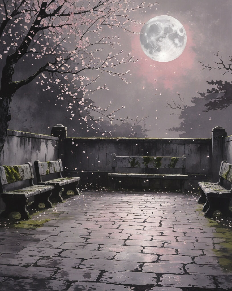 Falling cherry blossoms in a moonlit courtyard, capturing the bittersweet transience of life. A minimalist blend of Hokusai’s woodblock textures and faded ink washes for contemplative spaces.