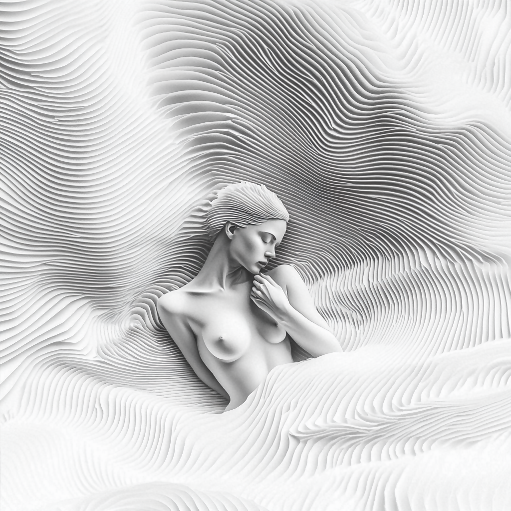 A body floats between layers of silent rhythm. This abstract AI-generated piece sculpts a reclining figure from monochrome waves, merging elegance with form. Light, movement, and stillness coexist in one continuous breath.