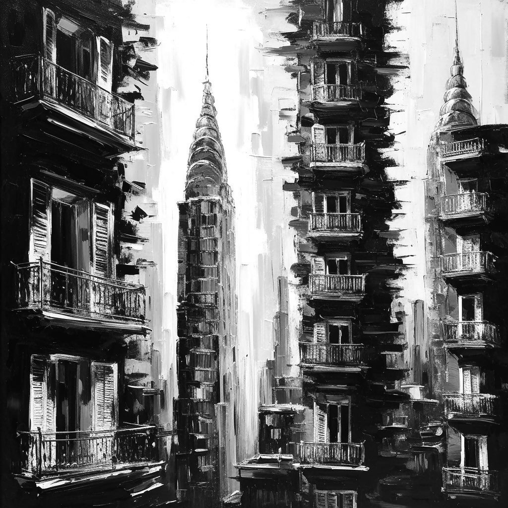 A captivating black-and-white painting depicting towering skyscrapers, including an iconic spire, reminiscent of classic New York architecture. The bold contrast of light and shadow enhances the cinematic feel, making this piece a striking visual statement for urban and architectural enthusiasts.