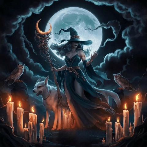 Our enchantress stands tall, her flowing dress and pointed hat silhouetted against an enormous, luminous moon. She wields a staff crowned with a glowing crescent, hinting at her connection to lunar magic. By her side, a loyal white wolf stands guard, while two wise owls perch nearby, completing her magical menagerie.