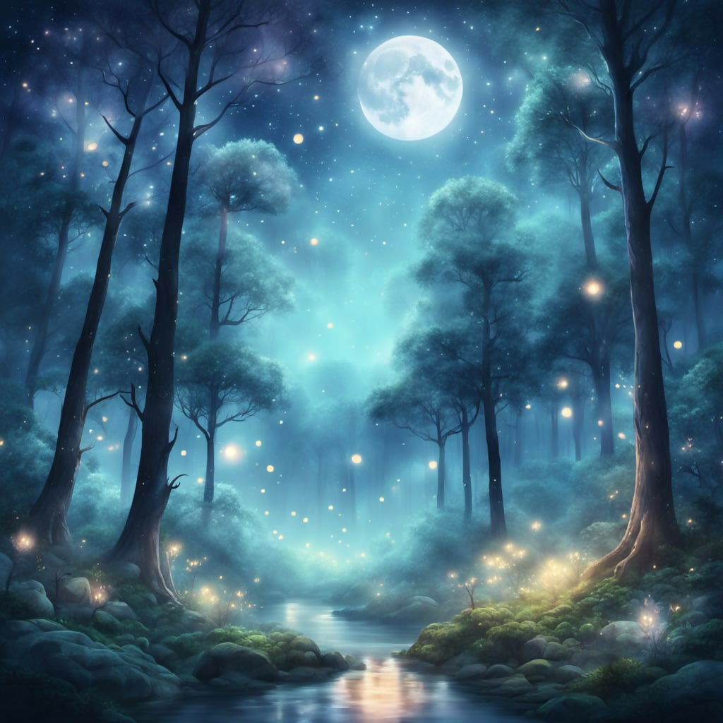 Under a luminous full moon, the forest breathes in silence as fireflies drift like floating stars—whispers of magic echoing through the midnight mist.