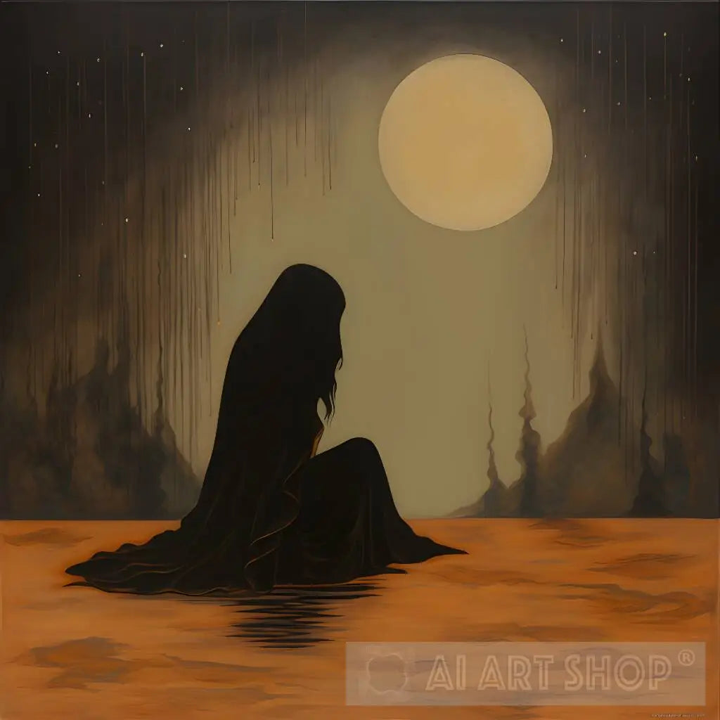 Immerse yourself in the enigmatic allure of 'Moonlit Lament.' This dark fantasy oil painting, set against an earth-toned backdrop, beckons the viewer into a world of untold stories. With a minimalist approach, it features halftone and lithographic elements that echo the ebru technique's dynamic essence. Each stroke narrates the silent burdens borne, forming a puzzle that captivates and intrigues.