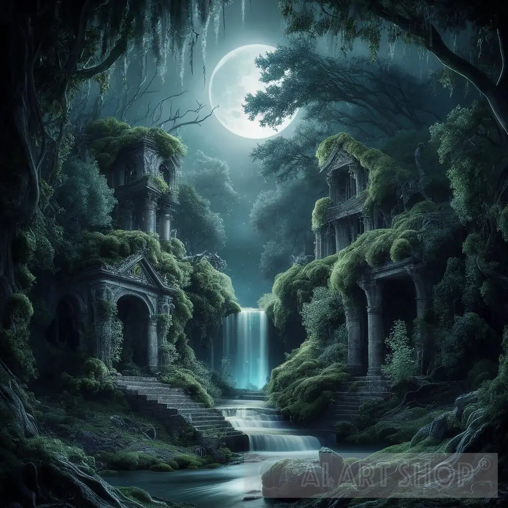 Capture the ethereal beauty of this moonlit forest. Elements of mystery, magic, and nature. The scene includes a luminescent waterfall, mythical creatures, or ancient ruins half-buried in moss. The colors evoke tranquility—deep blues, silvery grays, and hints of emerald green.