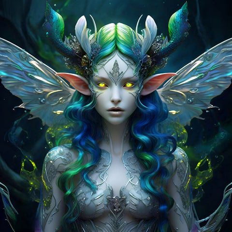 A fantasy image of a character with pale silvery skin, dappled with gray and scattered iridescent scales. The character should have striking yellow eyes and elfin finned ears, adding to their mystical appearance. Their hair should be long, dark blue, and green, wavy, enhancing the fantasy element. This character should embody a magical and ethereal quality, with the iridescent scales and unique features contributing to a sense of otherworldliness. The overall image should capture the beauty and mystery of this fantastical being, blending elements of fantasy and surrealism to create a captivating and enchanting portrait.