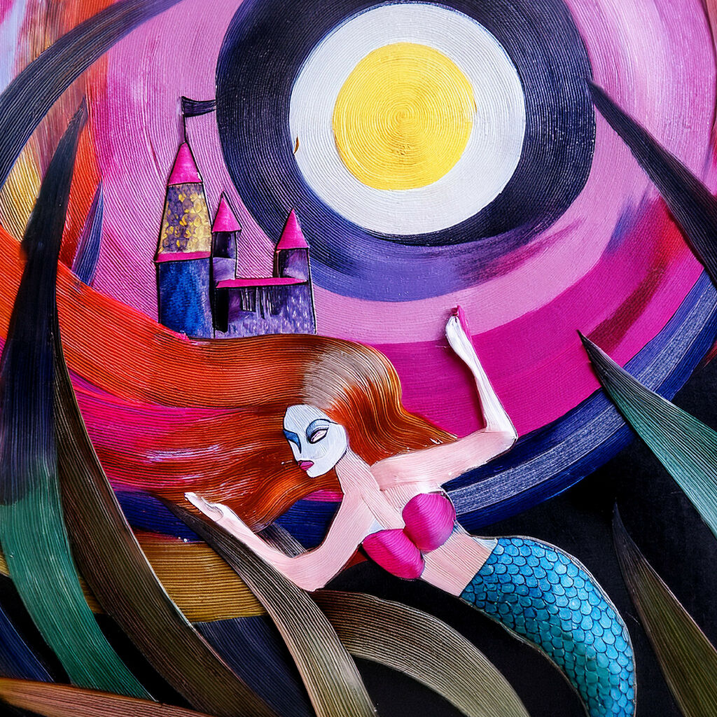 Dive into a surreal underwater fantasy where a vibrant mermaid glides through a psychedelic seascape under the glowing gaze of a full moon. With swirling textures, vivid hues, and a distant castle peeking through waves of color, this artwork blends fairytale charm with dreamlike abstraction.