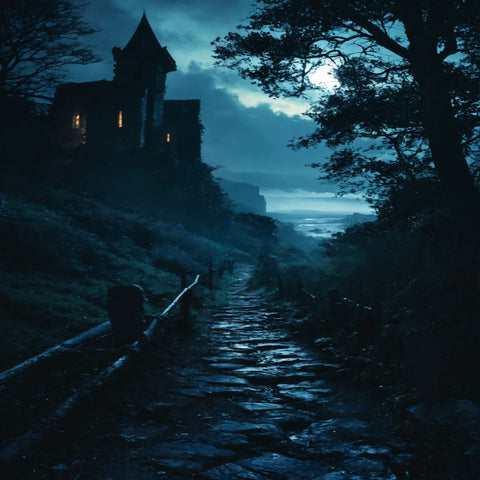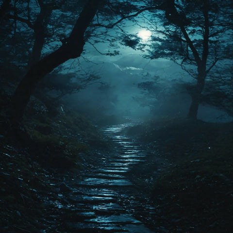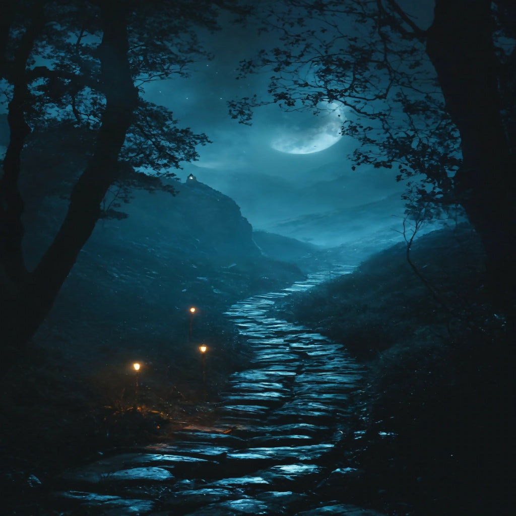 The image depicts a nighttime scene with a full moon partially obscured by clouds, illuminating a cobblestone path leading through a forest to an old, tall tower. The tower has lit windows suggesting occupancy, and it stands out as an imposing structure against the night sky. The setting is mysterious and evokes a sense of solitude or possibly adventure, as it could be from a fairy tale or fantasy story.