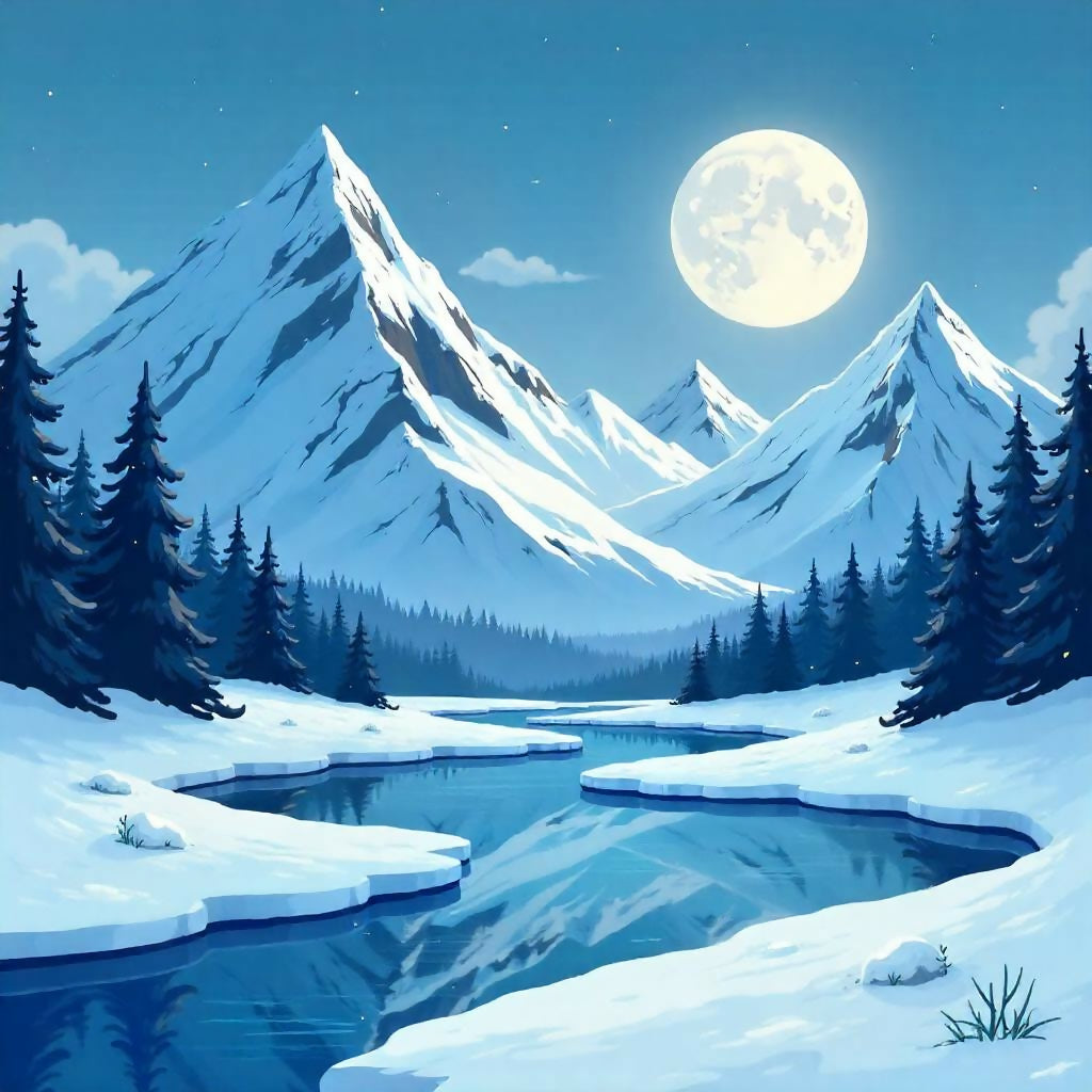 Step into a tranquil winter night with this breathtaking AI-generated artwork! A glowing full moon illuminates towering snow-capped mountains, reflecting beautifully in a frozen river. Surrounded by evergreen trees, this peaceful winter scene captures the magic of a cold, crisp night in nature.