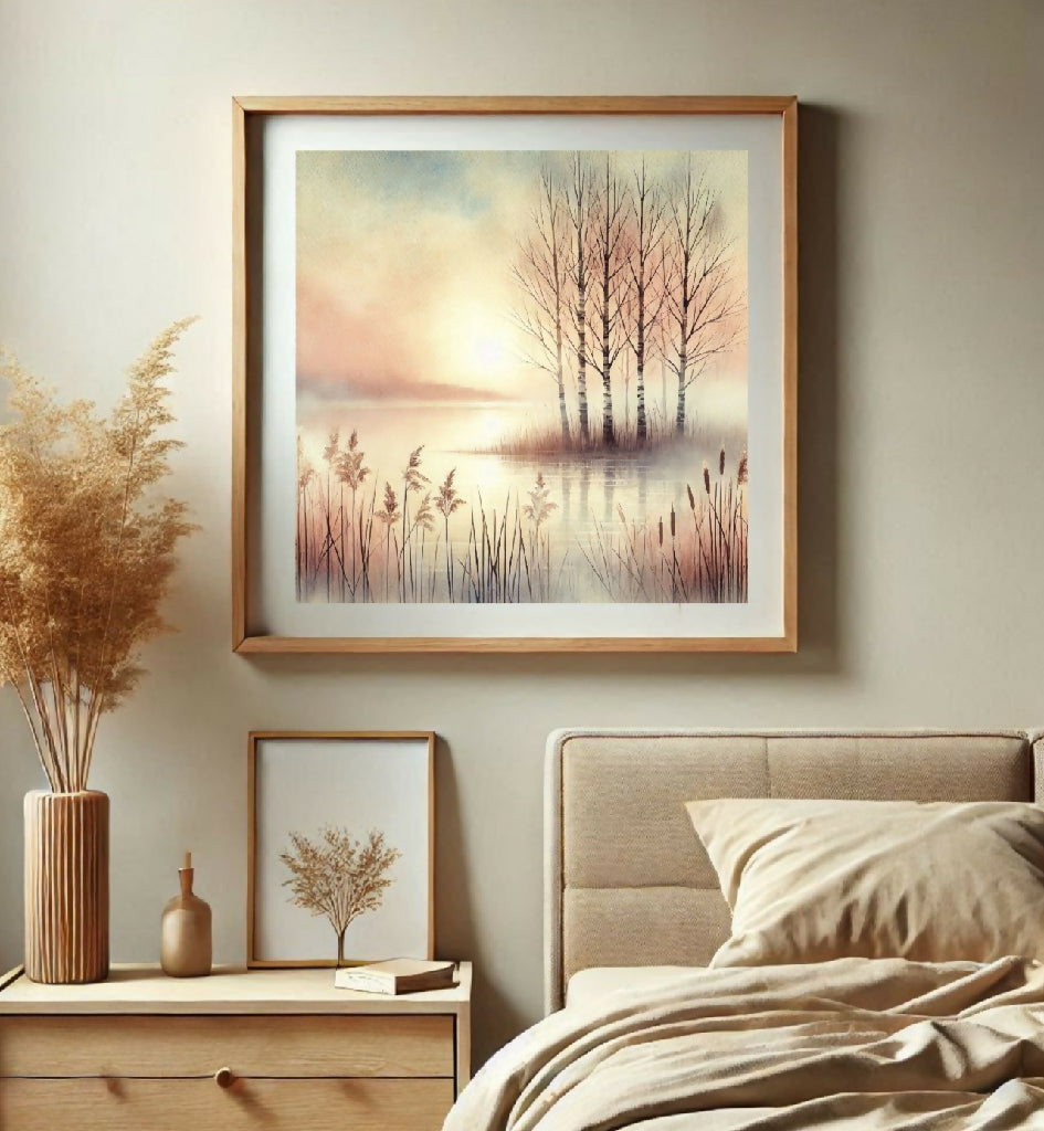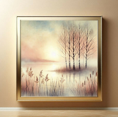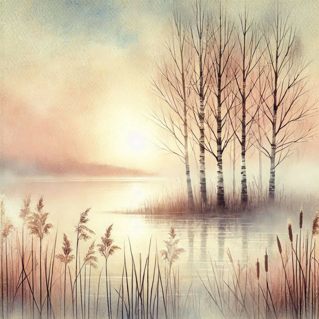 Eine ruhige Landschaft am Morgen, im Vordergrund stehen Schilfpflanzen am Ufer eines stillen Sees. Im Hintergrund stehen ein paar kahle Bäume auf einer kleinen Insel im Wasser. Der Himmel ist pastellfarben mit einem hellen Bereich, der die Sonne andeutet. Das gesamte Bild ist in weichen, pastellartigen Farben gehalten und wirkt friedlich und ruhig.