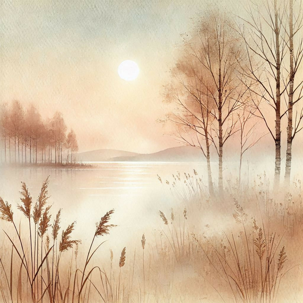 Eine ruhige, neblige Landschaft am Morgen. Ein stiller See ist im Vordergrund, gesäumt von hohen Schilfpflanzen. Im Hintergrund stehen schlanke, blattlose Bäume, die auf einer leicht hügeligen Landschaft liegen. Ein heller, schneller unscharfer Kreis, der wie die Sonne wirkt, ist am Himmel zu sehen. Die Farben sind gedämpft und in Erdtönen gehalten, hauptsächlich in Braun, Beige und Hellblau. Das gesamte Bild vermittelt ein Gefühl von Ruhe und Stille.