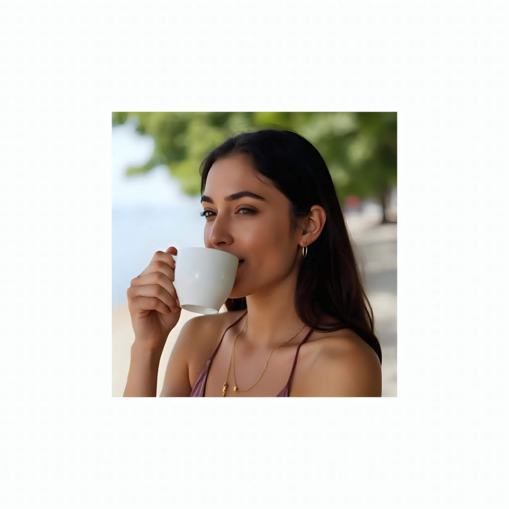 Celebrate morning calmness with this 8K top-quality image of a graceful young woman sipping coffee beside a river. Captured in soft morning sunlight with Canon EOS R5, the cinematic shot highlights her natural beauty, accurate anatomical features, and the serene riverside backdrop with crisp, focused details.