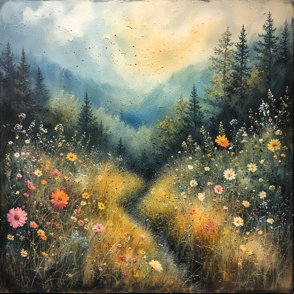 Towering pine trees stand sentinel along the edges of this floral paradise, their dark green needles a striking contrast to the soft hues of the flowers. A charming path meanders through the tall, swaying grass , beckoning you to explore its gentle curves.