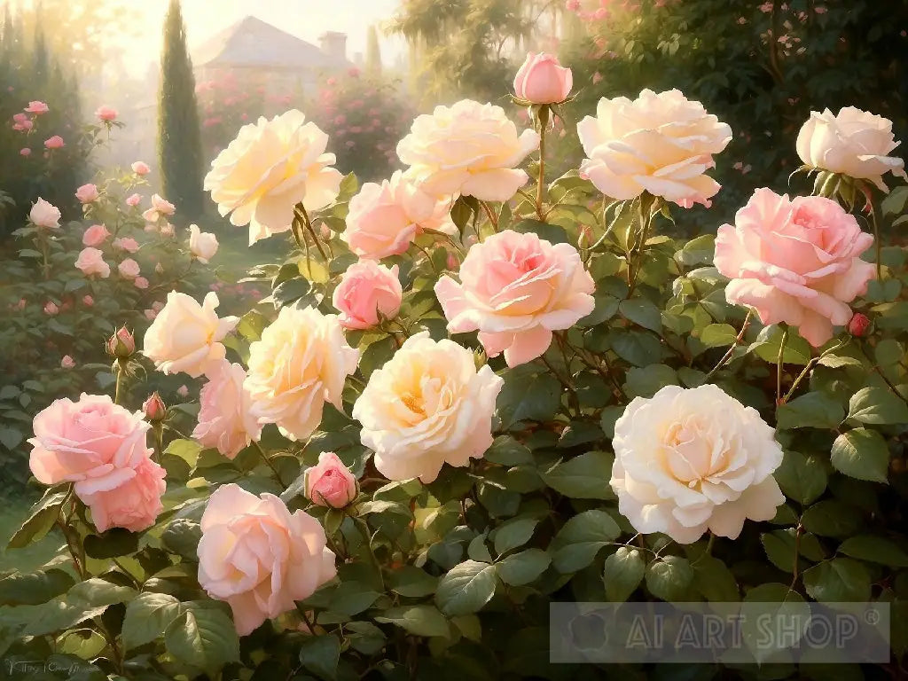 This painting depicts a lush rose garden bathed in the soft light of early morning. Dew glistens on the petals, and the interplay of light and shadow creates a serene, almost magical atmosphere. The delicate brushstrokes capture the vibrant colors and the subtle variations in the blooms.