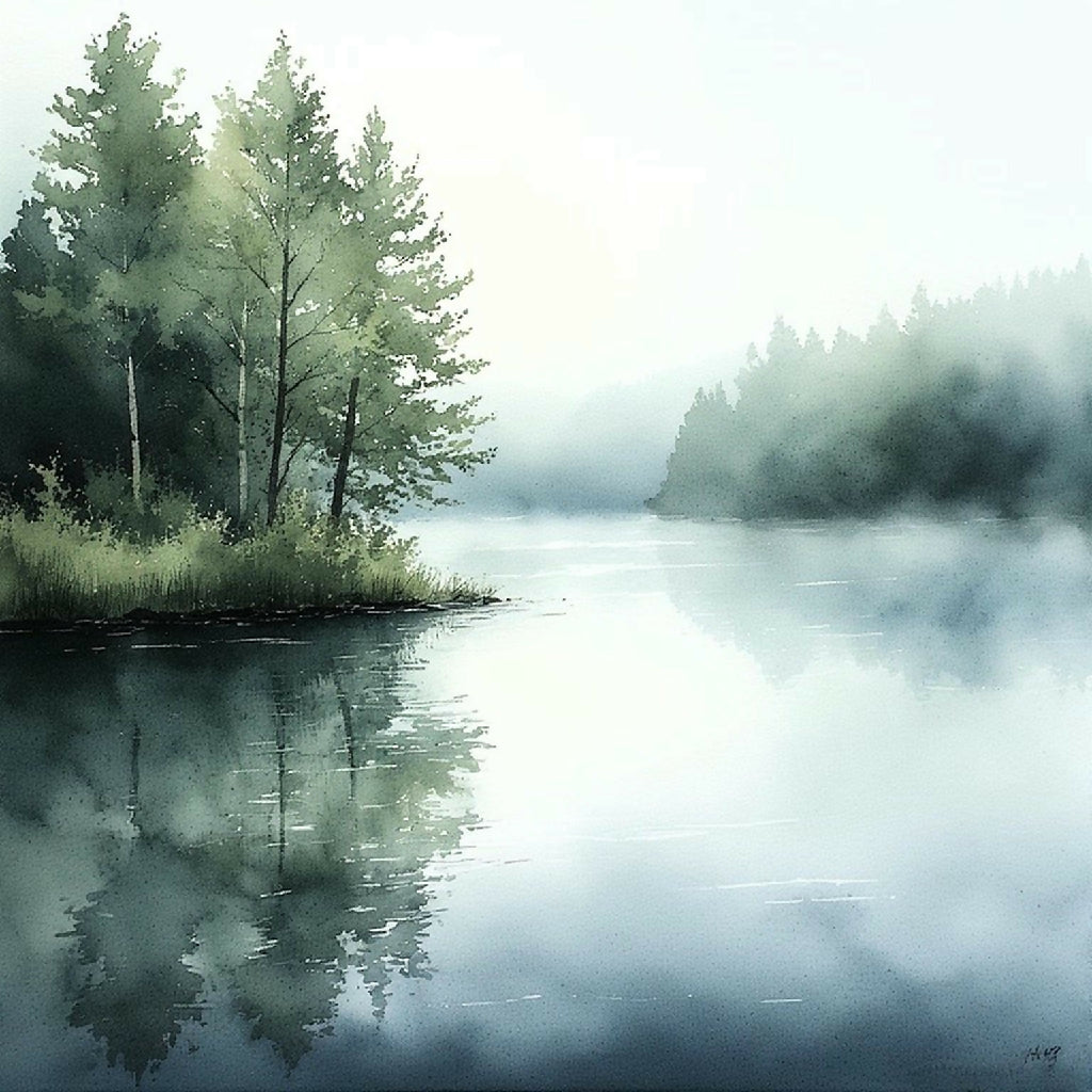 This watercolour painting captures the serene beauty of a misty morning on a tranquil lake. Tall, slender pine trees stand gracefully on the left bank, their forms softly mirrored in the calm, fog-kissed waters