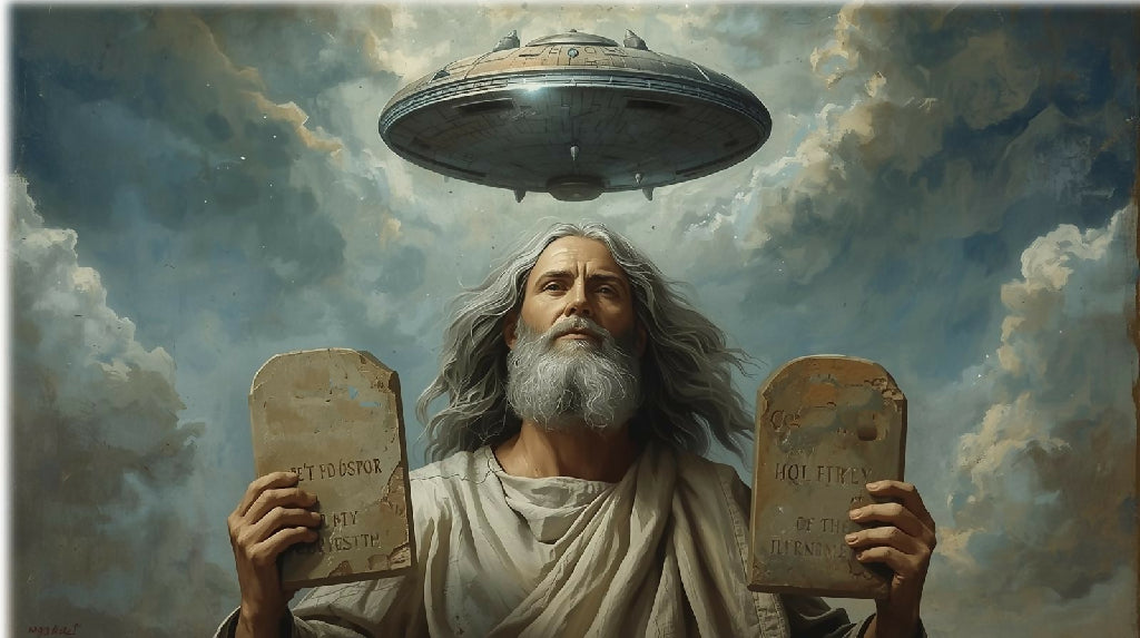 Vivid painting depicting Moses holding The Ten Commandments with a spaceship hovering above.