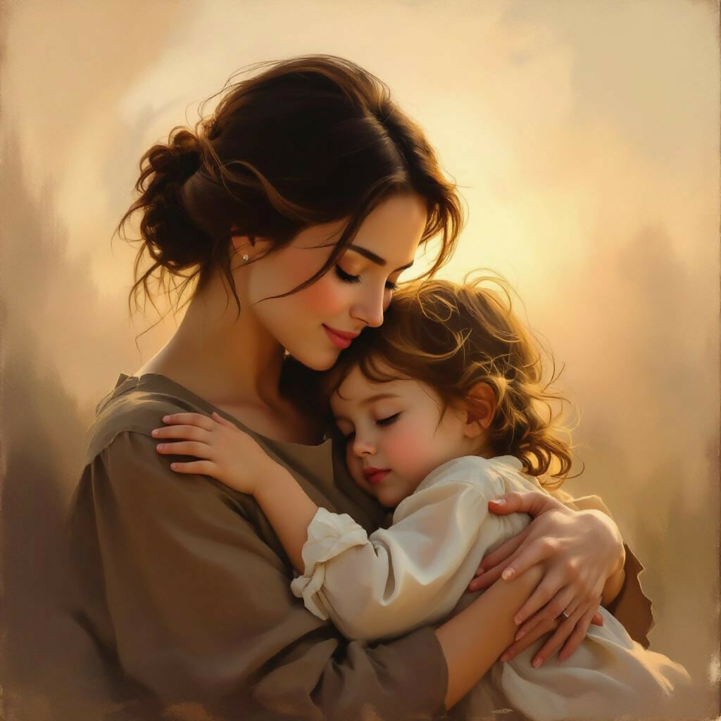 A heartwarming AI-generated artwork portraying a loving mother gently holding her child in her arms.