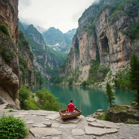 A peaceful travel scene showing a person in a boat gazing at a stunning emerald lake surrounded by towering cliffs, misty mountains, and lush green forest—a nature lover’s dream.