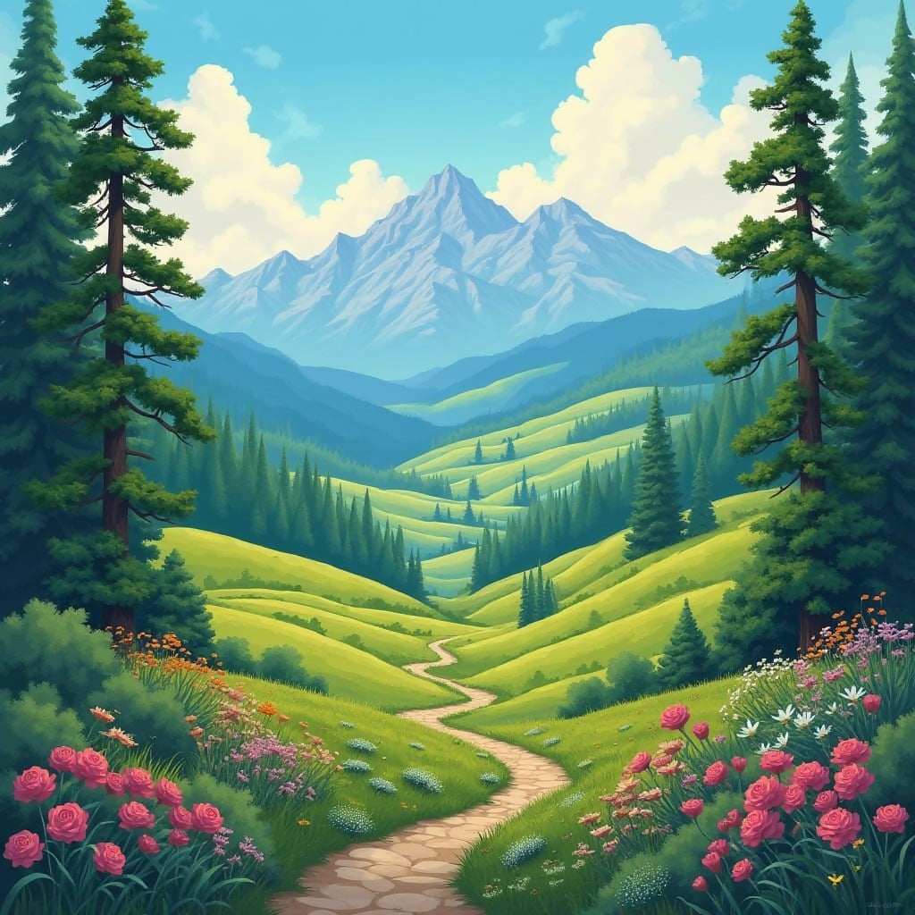 This ai generated painting shows a beautiful mountain landscape with mountains in the background and trees, meadows and flowers in th forground