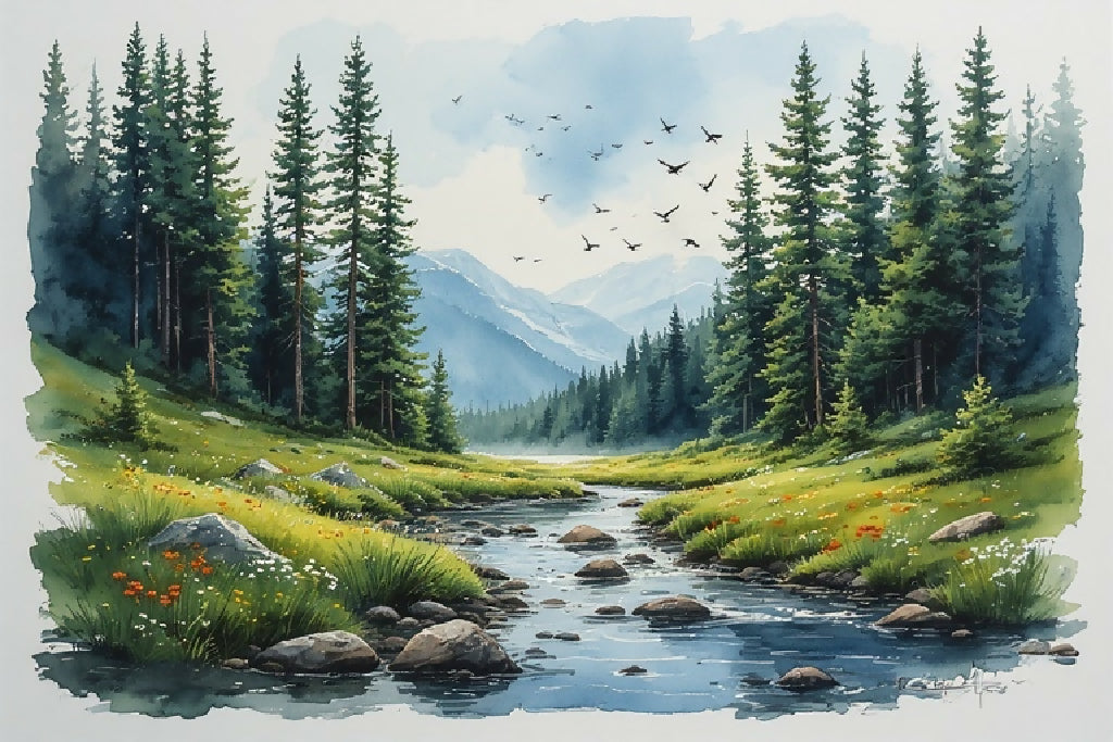 This piece beautifully depicts a gentle stream flowing through a verdant landscape dotted with colorful wildflowers and scattered rocks. Towering evergreen trees frame the scene, while a majestic mountain range looms in the background under a clear blue sky.