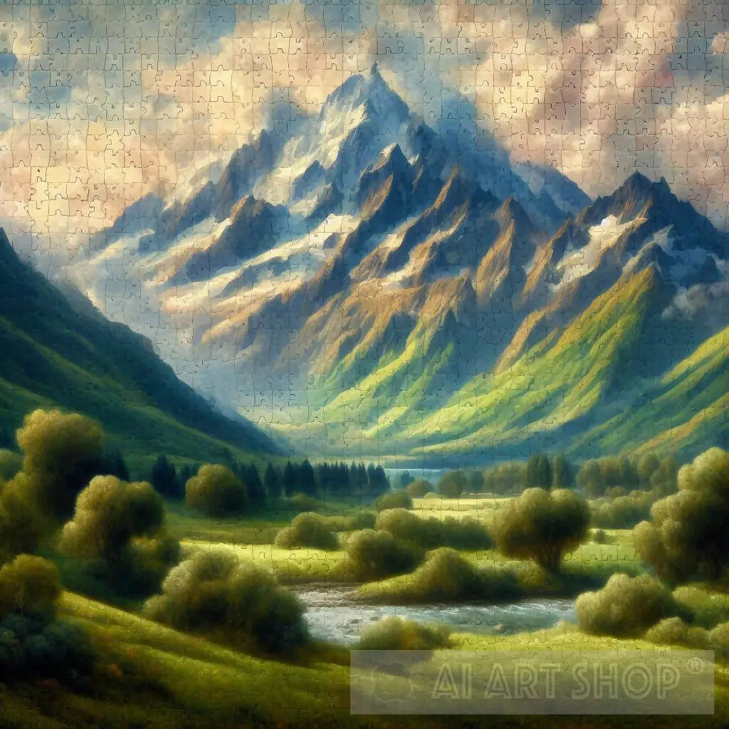 Softened diffuse light bathes the scene, creating an ethereal glow that captures the essence of the landscape after the rain. Each element, from the towering mountain to the delicate details of the trees, is a piece of puzzle art, seamlessly fitting into the larger composition. The result is a harmonious blend of realism and artistic interpretation, inviting viewers to lose themselves in the serenity of the natural world.