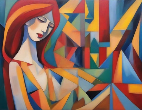 Una mujer pelirroja leyendo un libro. arte cubista.