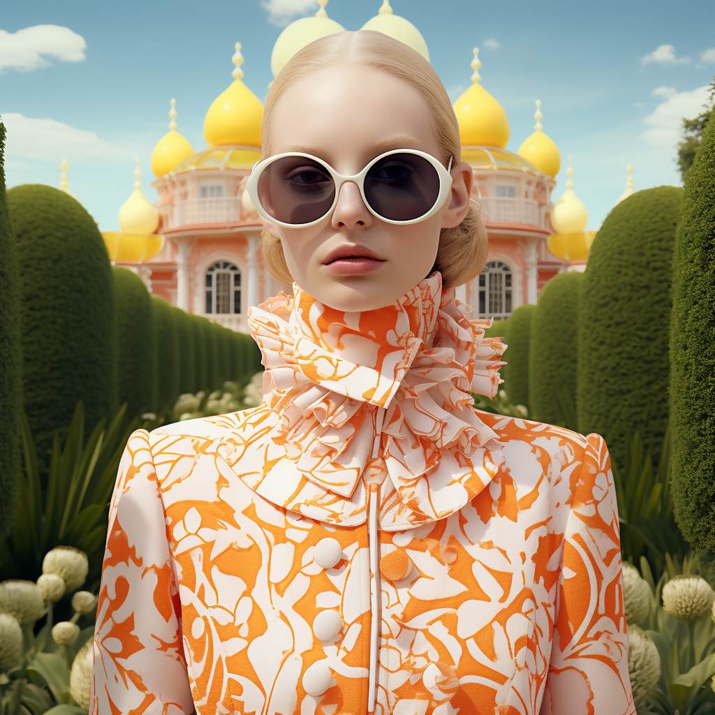 Tags: muses of light, Lumira, golden garden, surreal fashion, floral blouse, temple elegance, editorial portrait, radiant muse, architectural serenity
