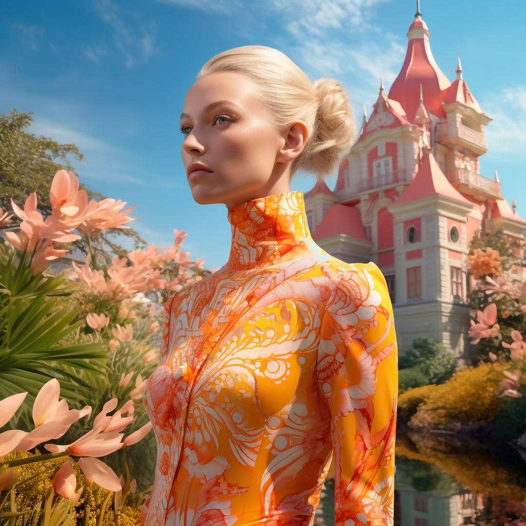 Tags: muses of light, Seraphine, surreal fashion, floral muse, embroidered elegance, fantasy garden, editorial portrait, digital art, castle backdrop, radiant nature