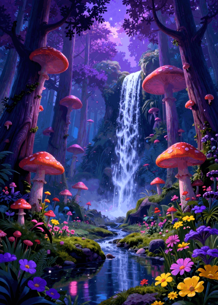 Deep within a forgotten grove where time stands still, "Mushroom Falls" reveals a world of neon flora and ancient magic. This vibrant landscape features a towering crystalline waterfall that feeds a glowing stream, surrounded by giant, spotted fungi that pulse with a soft, bioluminescent light. As you trace the winding path of the water through the purple-hued forest, the pareidolia of the woods begins to take effect—the gnarled bark of the trees and the shadows between the blooms seem to hide the watchful eyes of forest spirits. This piece is a celebration of color and imagination, designed to transform any digital space into a portal to another realm.