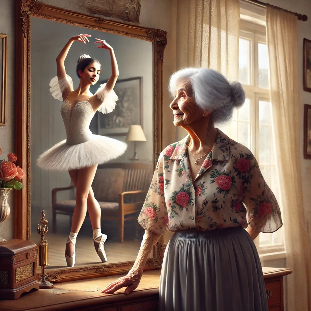 This nostalgic painting captures an elderly Latina woman standing before an ornate mirror, gazing lovingly at her reflection. In the mirror, her younger self is depicted as a radiant teenage ballerina mid-pose, wearing a delicate white ballet costume and pointe shoes, exuding grace and poise.