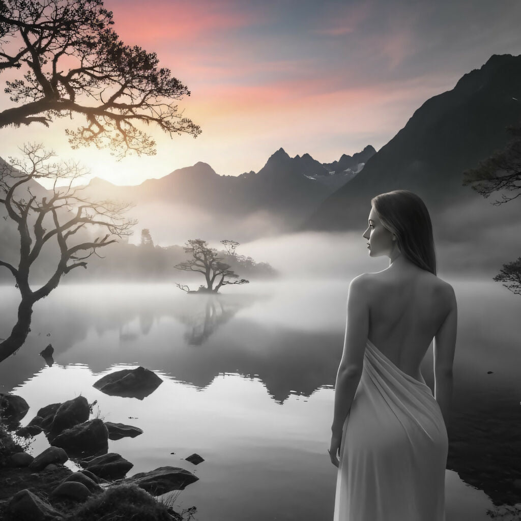 Serene portrait of a woman draped in white, standing by a misty mountain lake under a dramatic dawn sky.