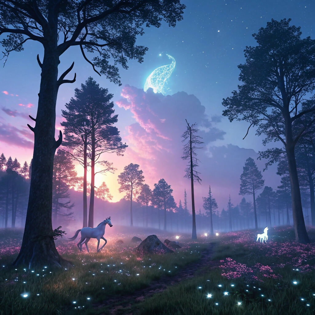 A digital painting or illustration depicts a serene, magical forest scene at dawn or dusk.