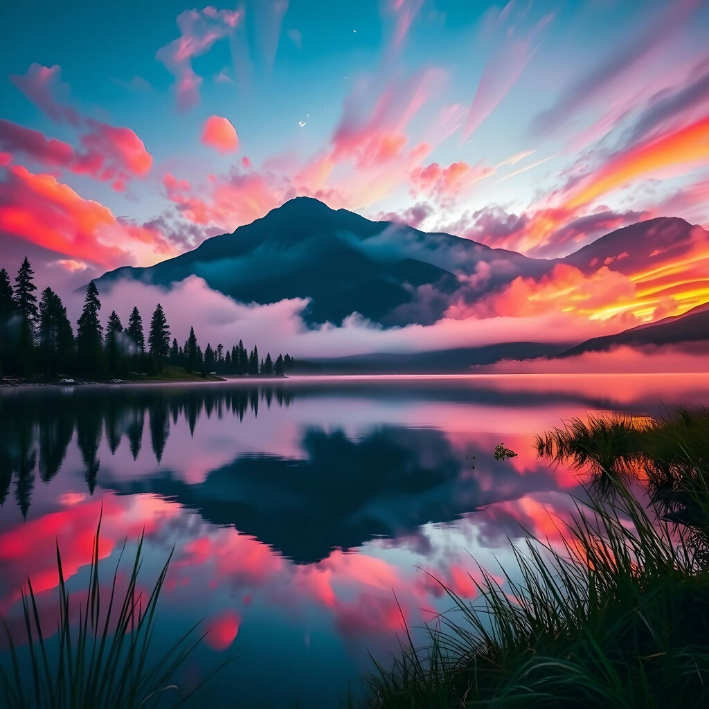 This AI-generated artwork captures the ethereal beauty of a tranquil lake surrounded by tall grasses, pine forests, and a mist-shrouded mountain. The sky glows with dramatic hues of pink, orange, and purple, reflecting vividly on the water’s surface. A perfect blend of serenity and spectacle, this piece evokes the quiet magic of nature at sunrise or sunset, inviting viewers into a moment of peaceful wonder.