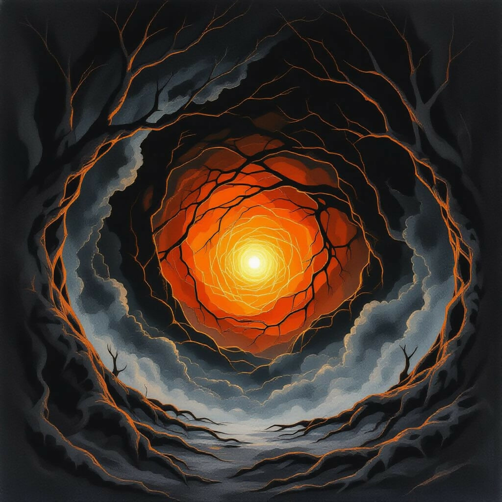 This AI-generated artwork features organic, swirling shapes in charcoal black, ash gray, burnt orange, and copper. It evokes a mysterious, ritualistic mood with rich textures and soft gradients.