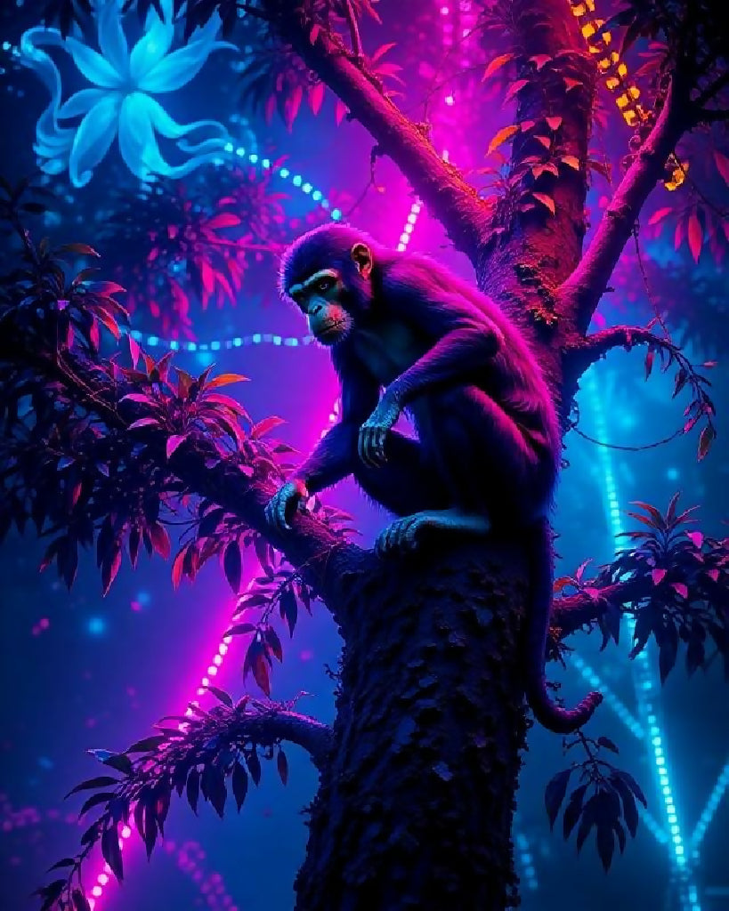 This image depicts a mystical monkey with deep blue, neon-like fur sitting on a tree in a futuristic jungle. The environment is illuminated by glowing plants, bioluminescent vines, and radiant flowers, casting vibrant shades of blue, purple, and pink across the scene. The monkey appears thoughtful as it gazes into the distance, surrounded by a surreal, almost dreamlike atmosphere. The background features shimmering lights and delicate glowing lines, adding a science fiction and fantasy touch. The overall composition is highly detailed, ultra-realistic, and enhanced with a cinematic lighting effect.